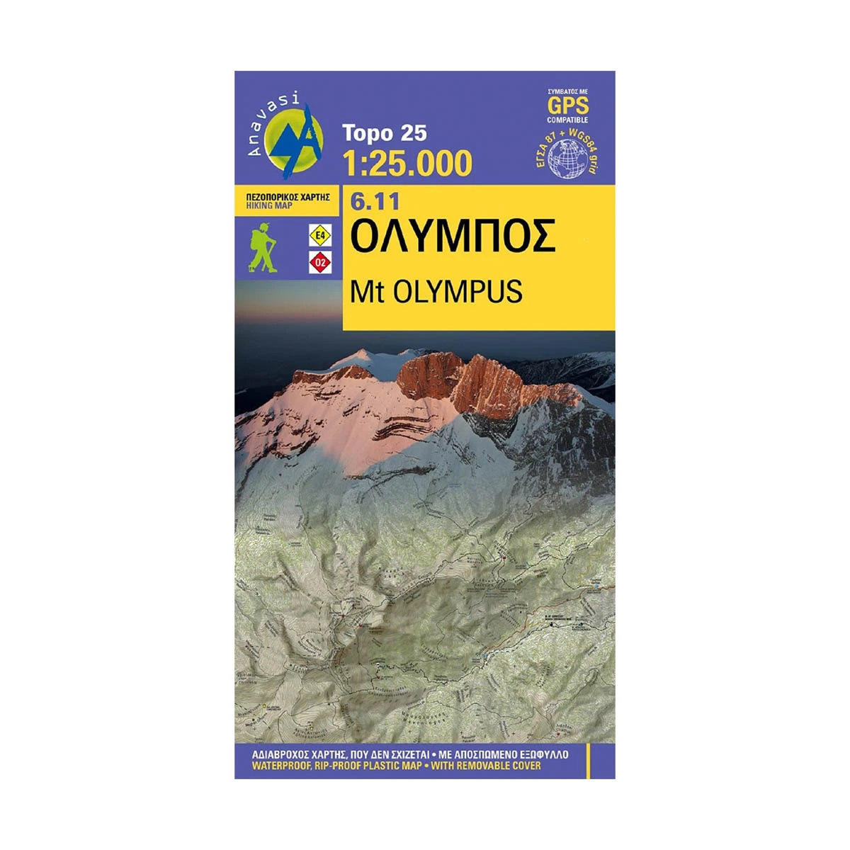 Εμπνευσμένοι από τη μοναδική φύση του μυθικού βουνού, φτιάξαμε ένα μοναδικό χάρτη για τον Όλυμπο. H μία πλευρά καλύπτει ολόκληρο το βουνό σε κλίμακα 1:30?000 δίνοντας μια γενική εικόνα όλων των μονοπατιών που διασχίζουν το βουνό και όλων των σημείων πρόσβασης. Η άλλη πλευρά εστιάζει σε κλίμακα 1:10?000 στις κορυφές και τα προηγμένα καταφύγια.